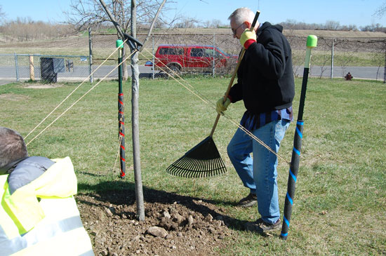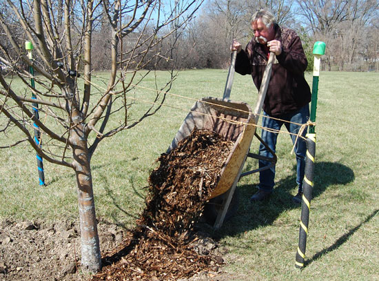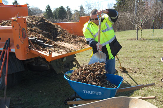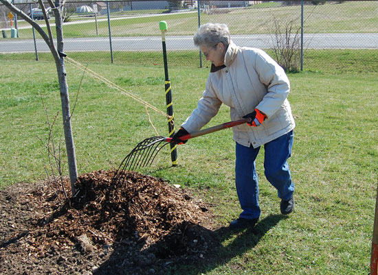 It was a working celebration, with participants spreading wood chips at the base of the trees at the park.