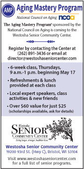 Contact the Westosha Senior Community Center at (262) 891-3436 or email at director@westoshaseniorcenter.com to register for The Aging Mastery Program®.