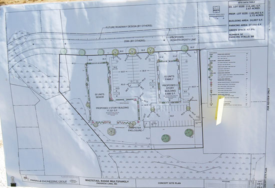 When completed, Whitetail Ridge will include a three-story building with 50 units for senior housing and a 10-unit rental town home style building not restricted to seniors. The project is being developed by Bear Development and was the recipient of tax credits from the state for building affordable housing. It is located west of Highway F and south of Highway 50 in Paddock Lake.