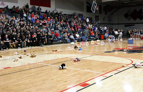 During halftime of the boys basketball game, Wilmot vs Central, Thursday night at Wilmot, stuffed animals were thrown on the court for a Teddy Bear Toss. The toys were collected for Toys for Tots. The stuffed animals were collected by Be The Change Team.