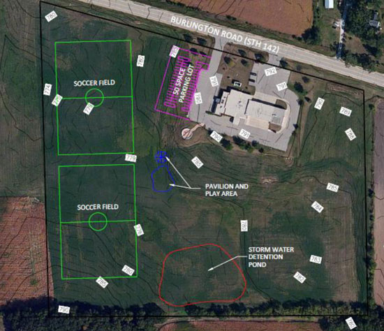 Another slide shows a layout for the Town Hall site that included athletic fields, a play lot and additional parking.